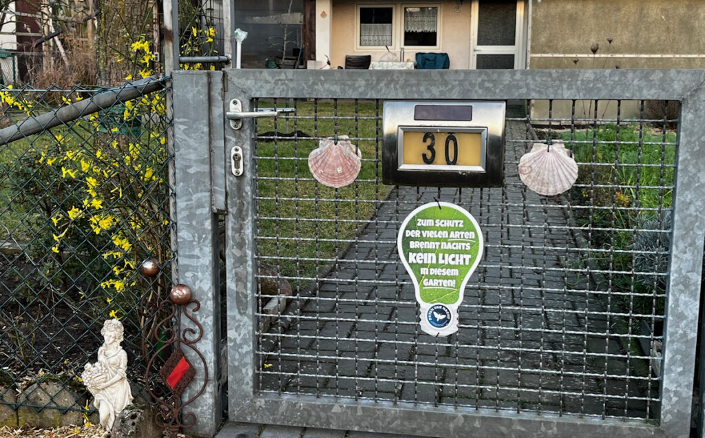 Mit Schild und Flyer-Angebot von Paten der Nacht an unserem Gartentörchen hoffen wir, dass Mitgärtnernde und BesucherInnen der Anlage für diese Problematik sensibilisiert werden und Lust haben, einfach nur durch das Weglassen von Licht (oder ggfs. der „richtigen“ Lichtwahl) einen wertvollen Beitrag zum Erhalt unserer Artenvielfalt zu leisten!“